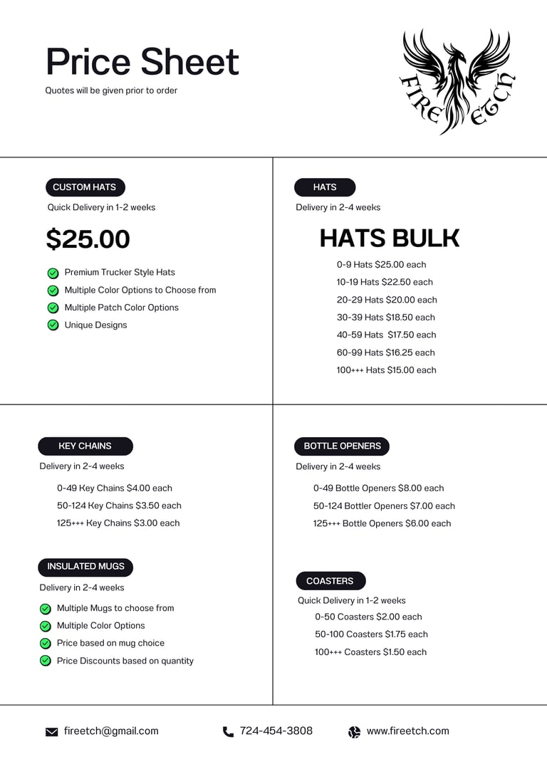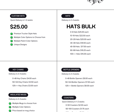 Customers requesting bulk customized products will be provided a quote complete with pricing based on quantity, type of product, and lead time. (Due to supply chain issues lead times can vary)